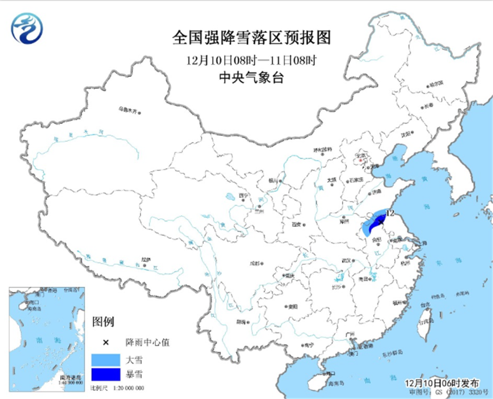 受冷空气影响,内蒙古中西部、西北地区东部、华北、黄淮等地有4~6级偏北风,局地有10℃左右降温;中东部地区最低气温0℃线将位于江南北部至贵州中部一带,江淮、江汉、贵州中北部、江南北部最低气温为-3~-1℃;山东南部、河南东部、江苏西北部、安徽北部的部分地区有中到大雪,其中,安徽东北部、江苏西北部局地有暴雪(10~12毫米)。